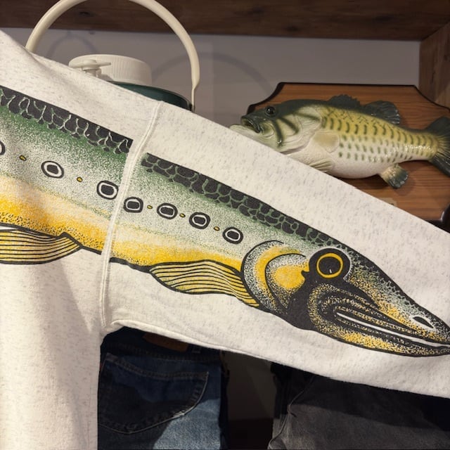 両袖にかけて北米に生息する巨大魚マスキーパイクがデザインされた名作。