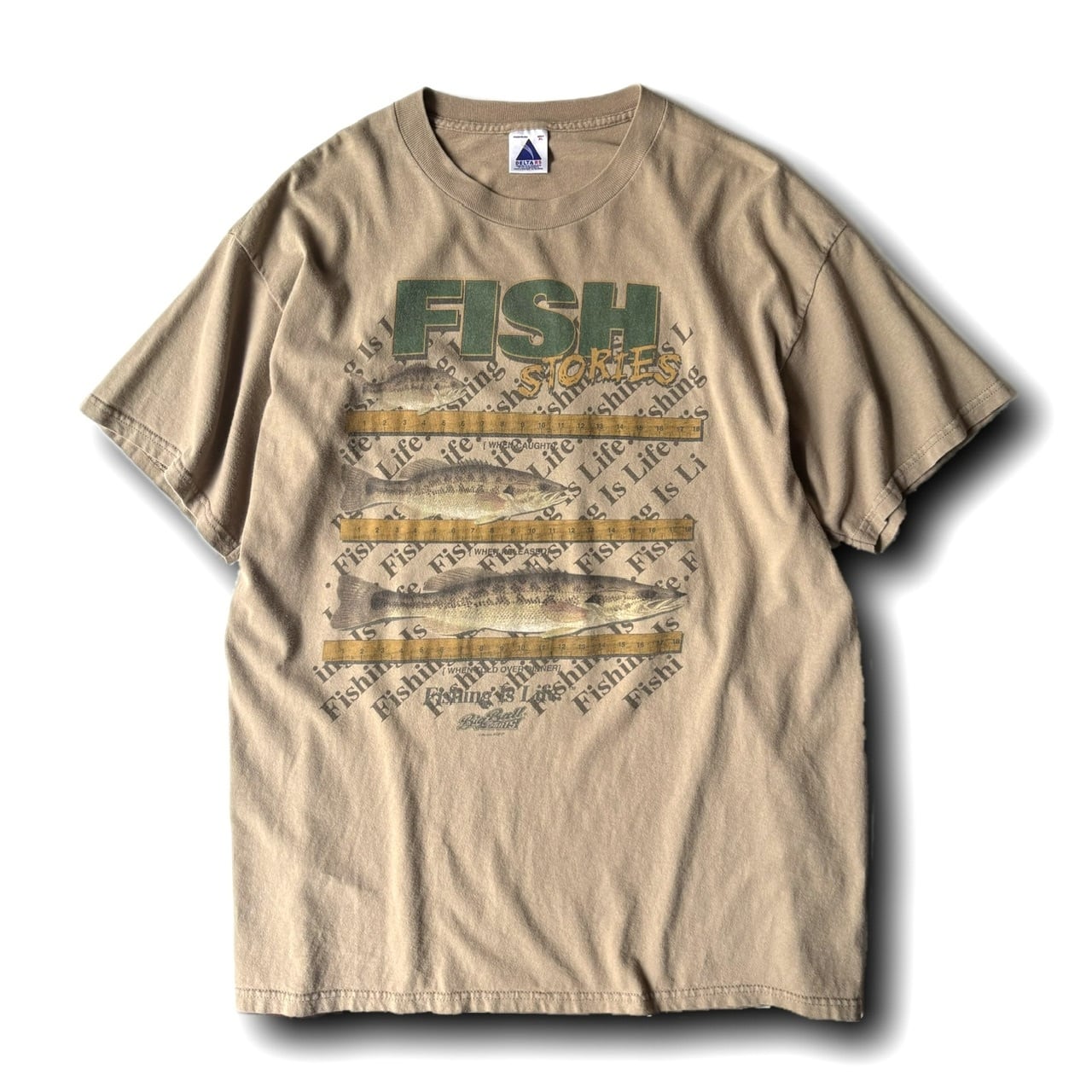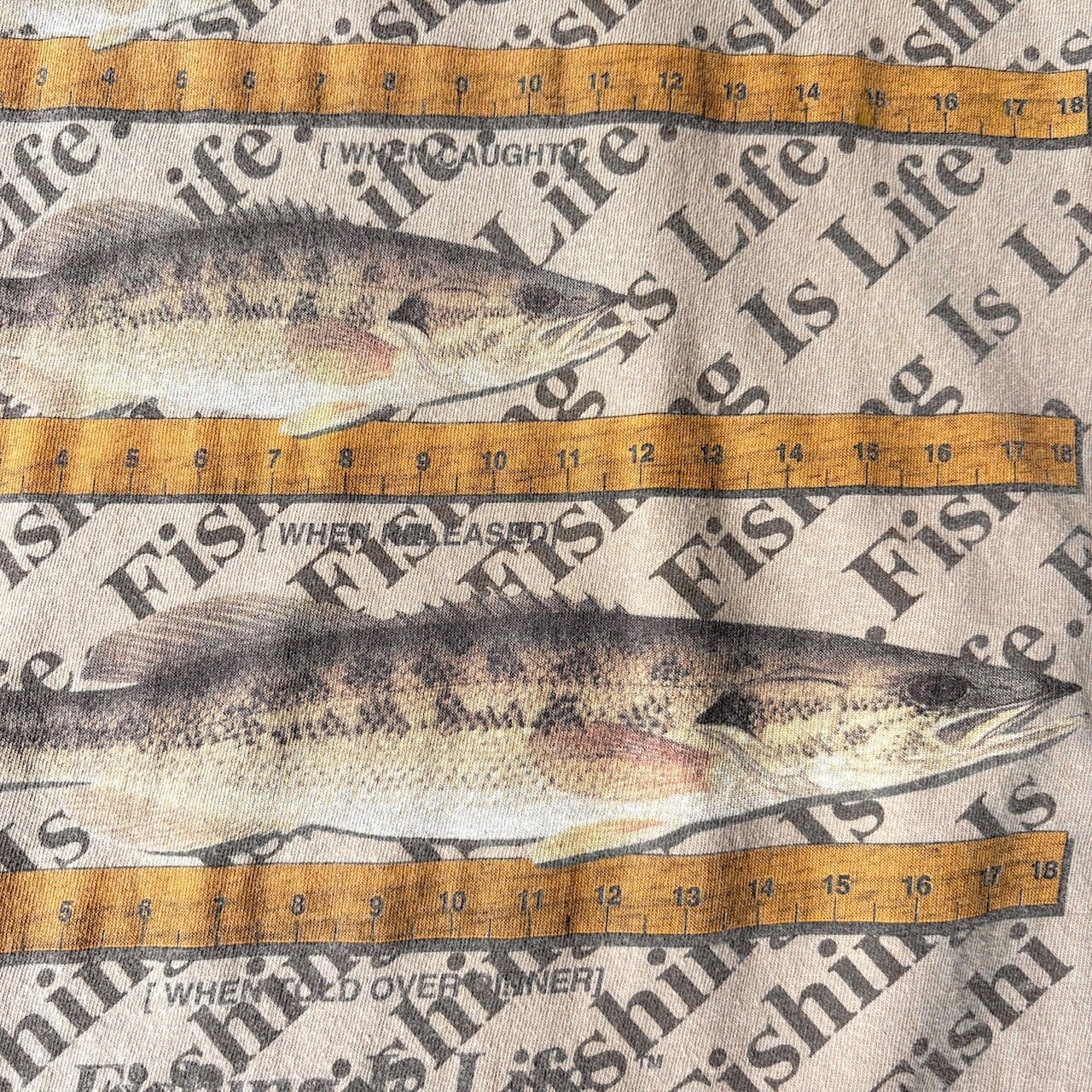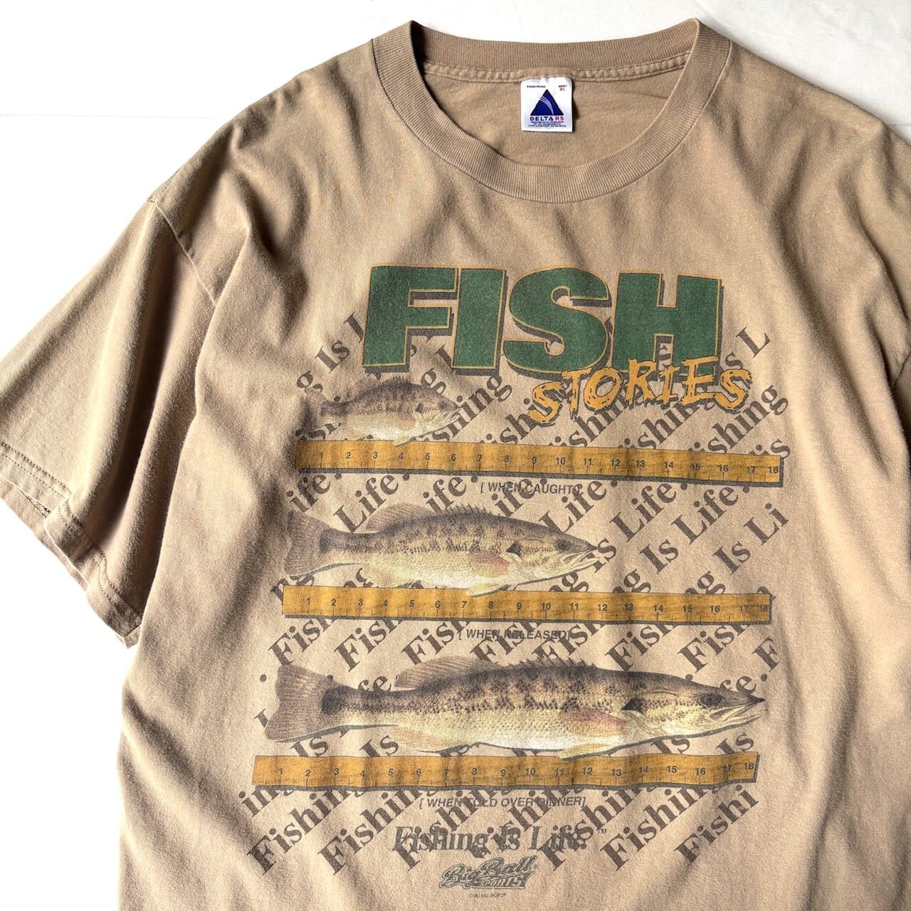 サイズを誇張する釣り人をユーモアたっぷりに表現しています。